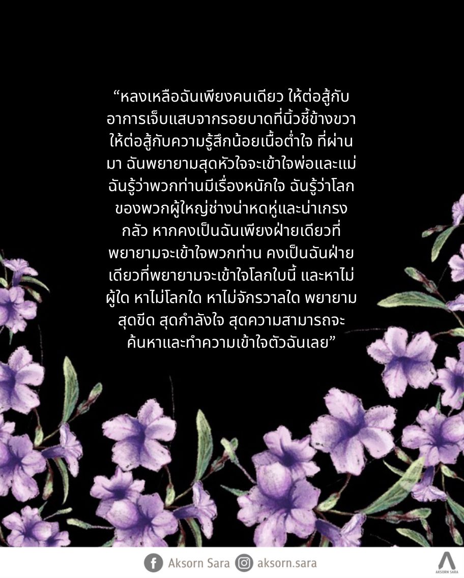เราวนกลับมาหน้าบ้าน และตัดสินใจว่ารอบเดียวถือว่าคุ้มเพียงพอ แม่เหม่อลอยถอดถุงเท้าทีละข้าง และโยนพวกมันลงตะกร้า แม่เดินอย่างไร้ความตระหนักรู้ต่อสิ่งรอบข้างไปนั่งลงบนโซฟา—ตำแหน่งที่เธอโปรดปราน ฉันก้าวย่างอย่างเชื่องช้า และคิดว่าจะขึ้นไปบนห้อง ลูกทำไปทำไม ฉันชะงักหยุดยืนอยู่บนขั้นแรกของบันได ทำเพื่อเรียกร้องความสนใจเหรอ แล้วถ้าคำตอบคือ ใช่ ฉันจะยิ่งดูน่าสมเพชกว่าเดิมไหม ทำไมลูกถึงทำแบบนั้น ทำไมทำอะไรไม่คิด ทำไมไม่นึกถึงคนที่ต้องอยู่ต่อบ้าง ทำไมต้องทำร้ายจิตใจแม่ซ้ำแล้วซ้ำเล่า แม่กับพ่อไปทำอะไรให้ลูกนักหนา ฉันปล่อยให้ความเงียบดำเนินไปราวกับนั่นคือคำตอบ ทำไมลูกต้องทำแบบนี้ ลูกรู้ไหมว่าแม่เคยเห็นอะไร ลูกรู้ไหมว่าพ่อลูกโทษตัวเองหนักแค่ไหน ลูกรู้ไหมว่าแม่เห็นป้าลูก…ป้าจันนั่นแหละ ขาห้อยเหนือพื้น แม่เงียบหยุด ฉันเดาว่าใบหน้าแม่คงบิดเบี้ยว หากหาไม่น้ำตาใดไหลออกมาเช่นเคย ถ้าลูกทำแบบนั้นไปอีกคน พ่อกับแม่จะทนอยู่ยังไง ลูกอย่าเห็นแก่ตัวได้ไหม อยู่กับแม่นะ และใช่ ทุกอย่างก็เป็นเช่นเดิม ป้าจันที่จู่ๆ ก็หายตัวไปจากโลก ป้าจันที่เหล่าผู้ใหญ่พยายามกลบปัดทิ้งคำถามทั้งหลายว่าเพราะเหตุใดเธอถึงต้องจากโลกไปเร็วขนาดนี้ ป้าจันที่จากไปโดยไร้สัญญาณ หากทั้งหมดนั่นไม่เคยใช่เรื่องจริง บางทีป้าจันก็คงคิดเช่นนี้ ไม่ต่างกับฉัน อยู่ต่อไปเพื่อที่จะไม่ไปสร้างความเจ็บปวดให้ผู้อื่น หากทนอยู่ต่อไปก็ต้องกลายเป็นผู้ถูกรวดร้าวจากบาดแผลที่เคยมี เคยเหวอะหวะ และบัดนี้เริ่มเน่าน่าสยดสยองทำลายซ้ำย้ำเช่นเดิม ฉันไม่คิดว่าป้าจันทำเพราะเห็นแก่ตัวหรอก ป้าคงแค่ไม่อยากเจ็บอีกแล้ว ไม่อยากตื่นขึ้นมาเพื่อต่อสู้กับการกัดกินของแผลเน่าอีกต่อไปแล้ว ทุกคนอ้อนวอนไม่ให้พวกเราจากไปไม่ใช่เพราะรักหรอก พวกเขากลัว กลัวต้องมานั่งเจ็บปวดกับความรู้สึกผิด กลัวที่จะยอมรับว่าตนก็คือหนึ่งในสาเหตุ ทว่าพวกเราก็กลัวเช่นกัน พวกเรากลัวที่ตื่นมาเจอหน้าพวกเขา พวกเรากลัวที่จะต้องตื่นมาโดนด่าทอต่อว่า พวกเรากลัวเหลือเกินที่จะต้องรู้สึกโดดเดี่ยวแม้ไม่ได้อยู่คนเดียว กลัวเหลือเกินที่จะต้องขอร้องวิงวอนต่อพระเจ้าที่ไม่รู้จัก ไม่ได้นับถือ ให้ลบเลือนความรู้สึกที่ว่าพวกเราเป็นเพียงแค่กระผีกริ้น ไม่สลักสำคัญอะไร และสมควรหายไปในที่สุด