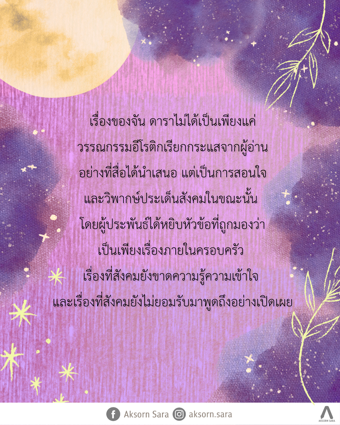 สรุปได้ว่าเรื่องของจัน ดาราไม่ได้เป็นเพียงแค่วรรณกรรมอีโรติกเรียกกระแสจากผู้อ่านอย่างที่สื่อได้นำเสนอ แต่เป็นการสอนใจและวิพากษ์ประเด็นสังคมในขณะนั้น โดยผู้ประพันธ์ได้หยิบหัวข้อที่ถูกมองว่าเป็นเพียงเรื่องภายในครอบครัว เรื่องที่สังคมยังขาดความรู้ความเข้าใจ และเรื่องที่สังคมยังไม่ยอมรับมาพูดถึงอย่างเปิดเผย พร้อมด้วยการเลือกเอากลวิธีการเล่าผ่านเรื่องเพศ ที่เป็นอีกหนึ่งด้านที่คนส่วนใหญ่มองว่าเป็นเรื่องส่วนตัว ไม่ควรพูดถึงต่อหน้าสาธารณะมาใช้ได้อย่างเฉียบแหลมและแยบยล ทั้งนี้ก็ต้องขอบคุณหม่อมราชวงศ์คึกฤทธิ์ ปราโมช บรรณาธิการของสยามรัฐอีกท่านหนึ่งที่ยอมให้เรื่องของจัน ดาราได้รับการตีพิมพ์ถึงแม้จะเป็นการสวนกระแสสังคมในขณะนั้นก็ตาม