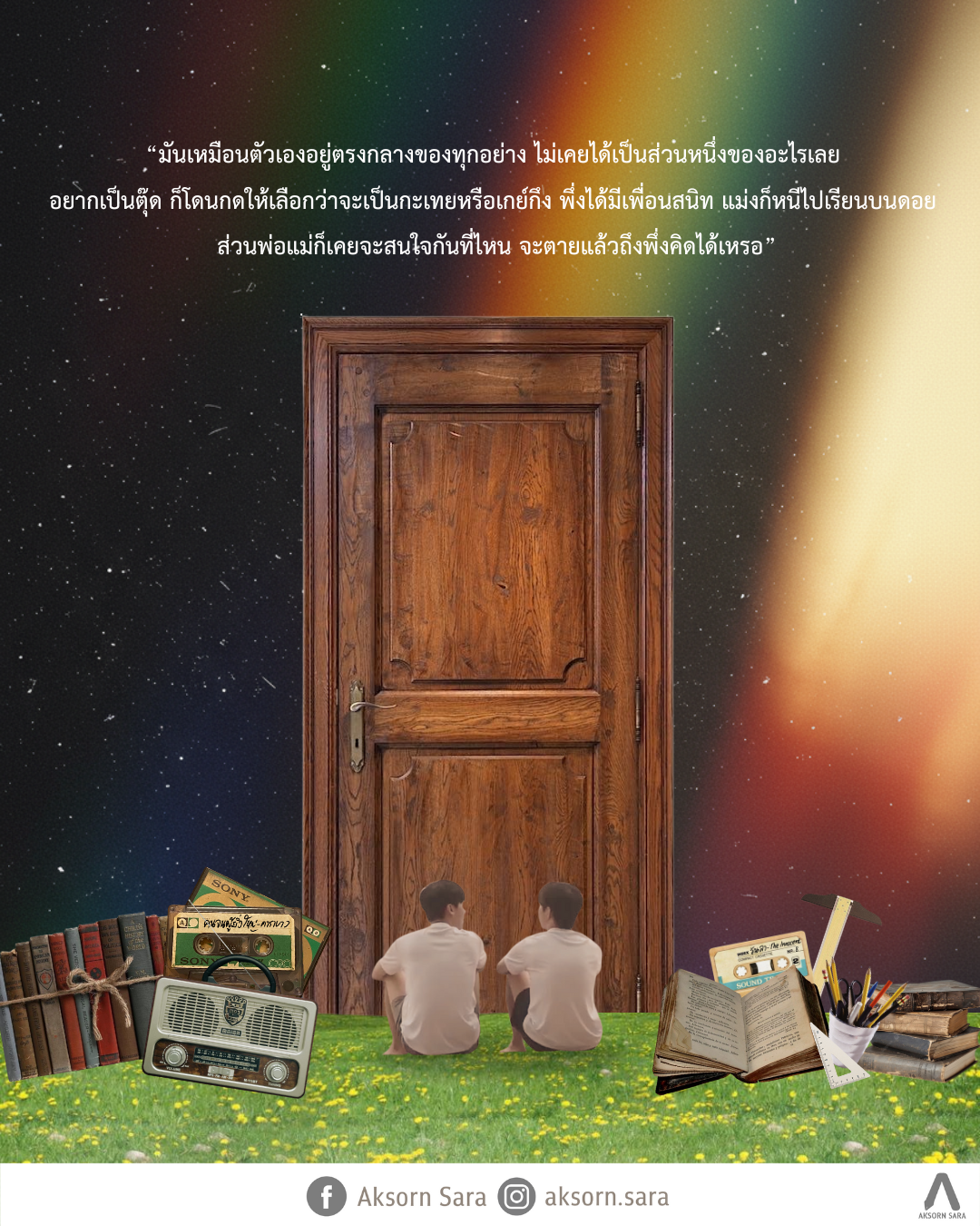 “มันเหมือนตัวเองอยู่ตรงกลางของทุกอย่าง ไม่เคยได้เป็นส่วนหนึ่งของอะไรเลย อยากเป็นตุ๊ด ก็โดนกดให้เลือกว่าจะเป็นกะเทยหรือเกย์กึง พึ่งได้มีเพื่อนสนิท แม่งก็หนีไปเรียนบนดอย ส่วนพ่อแม่ก็เคยจะสนใจกันที่ไหน จะตายแล้วถึงพึ่งคิดได้เหรอ”