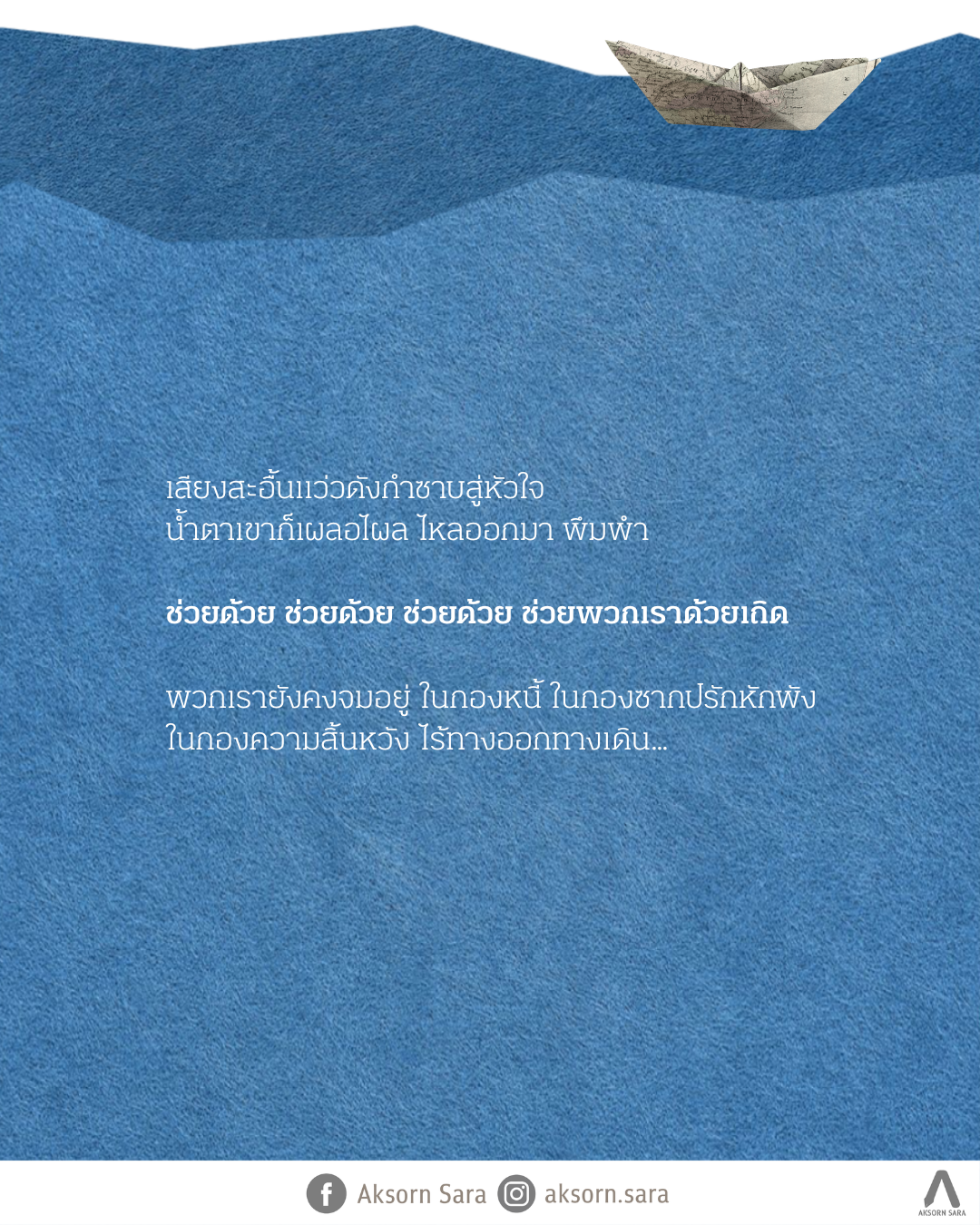 โชคดีที่วันนั้นไม่มีน้ำฝนเทลงมาอีก ข่าวดีอีกเรื่องนั่นคือน้ำค่อย ๆ ลด ขั้นบันไดที่ถูกมวลน้ำมหาศาลกลืนกินเมื่อไม่กี่วันก่อนเริ่มเผยกายรอดพ้นเหนือน้ำ จนท้ายที่สุด ร้านถ่ายเอกสารของเขาก็ถูกกอบกู้กลับมา หากการกอบกู้ครั้งนี้กลับไม่ต่างจากการเข้าร่วมสงคราม แม้ผลจะออกมาว่าฝ่ายเขาชนะ ผู้คนที่เสียไป เนื้อหัวใจที่หยุดเต้นลงมีเป็นร้อยเป็นพัน จะให้เรียกว่าชัยชนะก็ช่างขมขื่นและน่าละอายเกินกว่าจะประกาศชัยออกมาให้เต็มปาก เช่นกัน ชั้นหนึ่งของเขาไร้ซึ่งมวลน้ำแล้วก็จริง แต่ข้าวของทำมาหากินที่เขากู้เงินซื้อมา พังหมดสิ้น เครื่องถ่ายเอกสารล้มตึงไม่เป็นท่า คอมพิวเตอร์เคลือบโคลนดินจนไร้เค้าเดิม ชั้นวางนอนจมโคลน กระดาษ สันรูดกระจัดกระจาย เก้าอี้ไม้กลมที่เขาวางไว้รอลูกค้าขาหักจนเซล้มไปหลายตัว เหลือเพียงตัวเดียวที่ยังพอนั่งได้ไม่โคลงเคลงนัก เขาหยิบมันมาวางไว้หน้าร้าน และนั่งลง มองกองซากรถที่ทับซ้อนกันราวของเล่นเลโก้เด็ก มองซากขยะภูเขาใหญ่ มองผู้คนออกมาเดินอิดโรย เขาเห็นแม่ค้าร้านชาใต้เดินไปเดินมาพลางมองไปทั่วทิศเช่นเขา นางดูร่างซูบกว่าที่เคยเจอครั้งก่อน จนนางหันมาทางเขา มองเบี่ยงไปทางร้านชาของตนที่พังทลายไม่แพ้ร้านเขา แล้วอยู่ดี ๆ ก็ค่อย ๆ นั่งคู้ตัวอยู่กลางถนนที่รถไม่อาจสัญจร เสียงสะอื้นแว่วดังกำซาบสู่หัวใจ น้ำตาเขาก็เผลอไผล ไหลออกมา พึมพำ “ช่วยด้วย ช่วยด้วย ช่วยด้วย ช่วยพวกเราด้วยเถิด” พวกเรายังคงจมอยู่ ในกองหนี้ ในกองซากปรักหักพัง ในกองความสิ้นหวัง ไร้ทางออกทางเดิน…