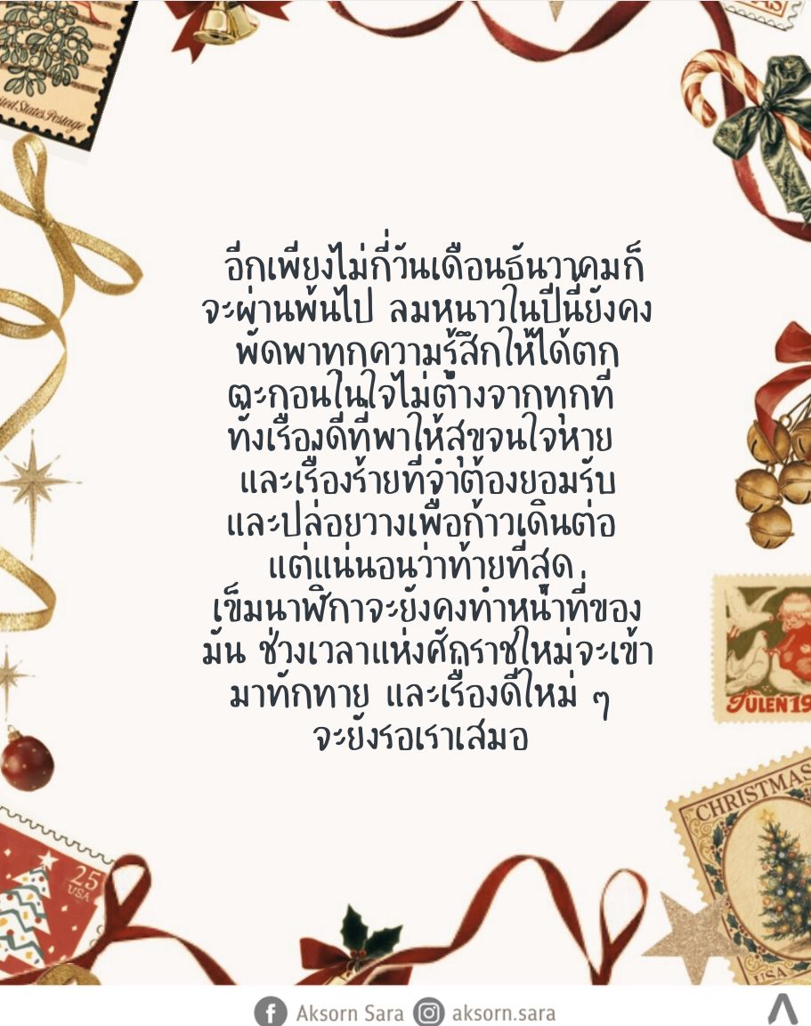 สุดท้ายนี้ อีกเพียงไม่กี่วันเดือนธันวาคมก็จะผ่านพ้นไป ลมหนาวในปีนี้ยังคงพัดพาทุกความรู้สึกให้ได้ตกตะกอนในใจไม่ต่างจากทุกที ทั้งเรื่องดีที่พาให้สุขจนใจหาย และเรื่องร้ายที่จำต้องยอมรับและปล่อยวางเพื่อก้าวเดินต่อ แต่แน่นอนว่าท้ายที่สุด เข็มนาฬิกาจะยังคงทำหน้าที่ของมัน ช่วงเวลาแห่งศักราชใหม่จะเข้ามาทักทาย และเรื่องดีใหม่ๆ จะยังรอเราเสมอ