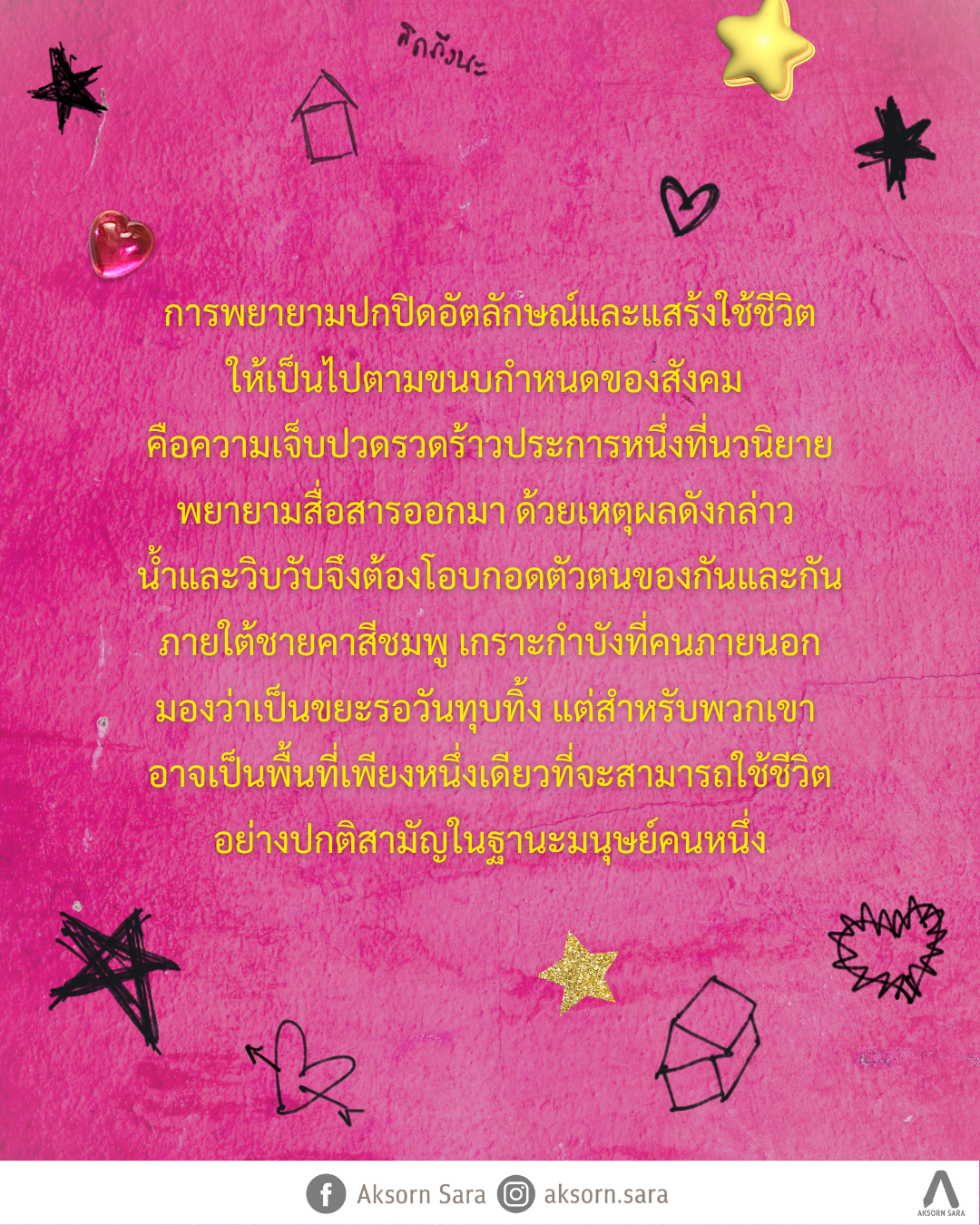 มีอยู่ตอนหนึ่งของนวนิยายที่น้ำถามวิบวับว่า “มึงหนีอะไรมา” วิบวับตอบกลับไปว่า “‘ก็ผมเป็นตัวเองที่บ้านไม่ได้’ น้ำโหวงท้องแปลกๆ นึกว่านั่นเป็นคำตอบของตัวเอง ที่ผ่านมา พวกเขามีหลายสิ่งหลายอย่างที่ต่างกันโดยสิ้นเชิง แต่ส่วนที่บิดเบี้ยวนั้น กลับเป็นเสี้ยวแต่แทบจะซ้อนกันพอดี” (น.178) ประโยคนี้แสดงให้เห็นว่าสิ่งหนึ่งที่ทั้งน้ำและวิบวับมีเหมือนกัน คือพวกเขาต่างก็ไม่สามารถเป็นตัวเองได้อย่างเต็มที่เมื่ออยู่ในพื้นที่อื่นๆ ทั้งพื้นที่บ้าน (ที่แท้จริง) และพื้นที่อื่นๆ ในสังคม พื้นที่เหล่านั้นบีบบังคับให้พวกเขากลายเป็น “คนอื่น” ทั้งเป็นอื่นกับผู้คนรอบตัว และเป็นอื่นกับตัวเอง การพยายามปกปิดอัตลักษณ์และแสร้งใช้ชีวิตให้เป็นไปตามขนบกำหนดของสังคมคือความเจ็บปวดรวดร้าวประการหนึ่งที่นวนิยายพยายามสื่อสารออกมา ด้วยเหตุผลดังกล่าว น้ำและวิบวับจึงต้องโอบกอดตัวตนของกันและกันภายใต้ชายคาสีชมพู เกราะกำบังที่คนภายนอกมองว่าเป็นขยะรอวันทุบทิ้ง แต่สำหรับพวกเขา บ้านหลังนี้อาจเป็นพื้นที่เพียงหนึ่งเดียวที่จะสามารถใช้ชีวิตอย่างปกติสามัญในฐานะมนุษย์คนหนึ่ง