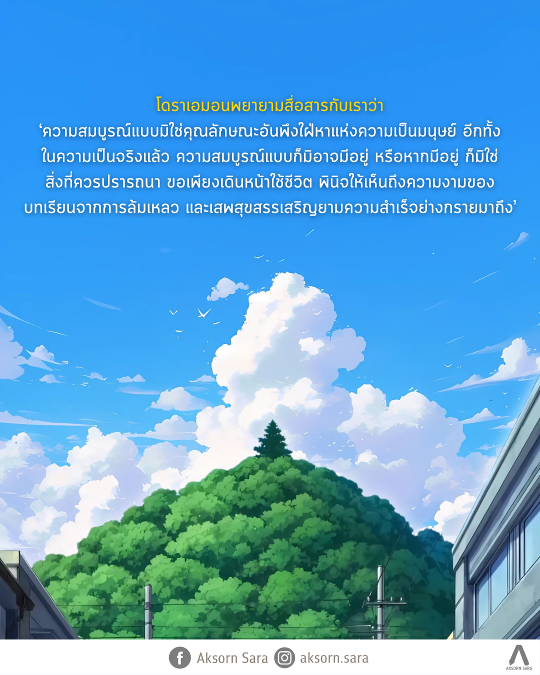 Key message หรือข้อความหลักของเรื่องโดราเอมอนที่สำคัญและมีคุณค่าที่สุดในทัศนะผู้เขียนคือเรื่องของความไม่สมบูรณ์แบบ โดราเอมอนพยายามสื่อสารกับเราว่า “ความสมบูรณ์แบบมิใช่คุณลักษณะอันพึงใฝ่หาแห่งความเป็นมนุษย์ อีกทั้งในความเป็นจริงแล้ว ความสมบูรณ์แบบก็มิอาจมีอยู่ หรือหากมีอยู่ ก็มิใช่สิ่งที่ควรปรารถนา ขอเพียงเดินหน้าใช้ชีวิต พินิจให้เห็นถึงความงามของบทเรียนจากการล้มเหลว และเสพสุขสรรเสริญยามความสำเร็จย่างกรายมาถึง”