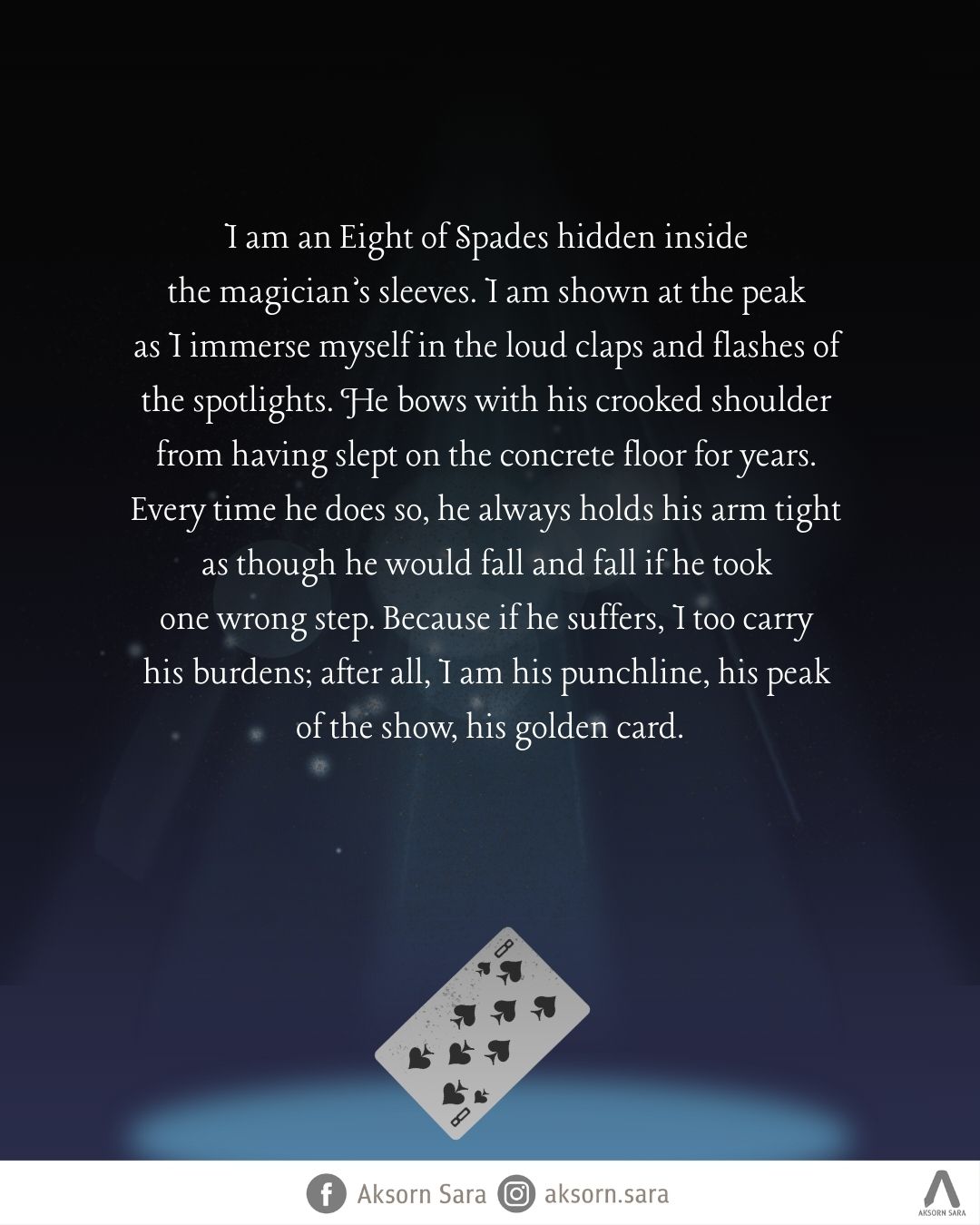 I am an Eight of Spades hidden inside the magician’s sleeves. I am shown at the peak as I immerse myself in the loud claps and flashes of the spotlights. He bows with his crooked shoulder from having slept on the concrete floor for years. Every time he does so, he always holds his arm tight as though he would fall and fall if he took one wrong step. Because if he suffers, I too carry his burdens; after all, I am his punchline, his peak of the show, his golden card.
